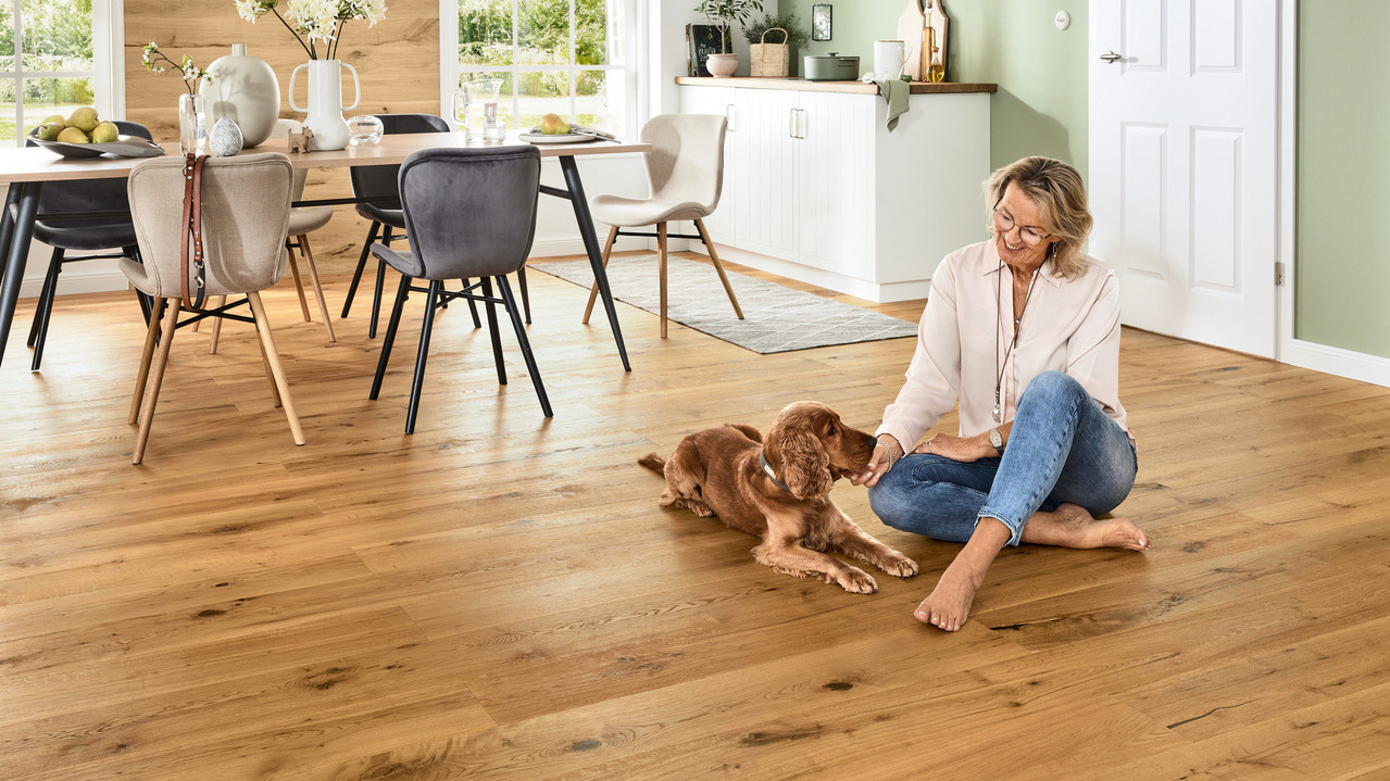 - HQ Landhausdiele Eiche Rustikal: Etwas markanter mit einer matt lackierten, strukturierten Oberfläche. Sie betont Äste und Maserungen und verleiht dem Raum einen lebhaften, natürlichen Ausdruck.